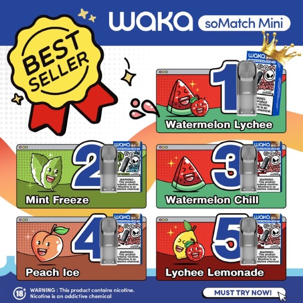 หัว Waka ออกแบบกลิ่นมาให้เลือก 9 กลิ่น เป็นแนวเครื่องดื่มและผลไม้ ใครเป็นสายนี้ไม่ควรพลาดที่จะลอง ให้กลิ่นและรสชาติชัดเจน หวานฉ่ำแต่ไม่เลี่ยน ความเย็นกลางๆ ออกแนวสดชื่น และ Waka Pod ยังมีกลิ่นแนวเย็นๆ โดยเฉพาะให้เลือกอีกด้วย